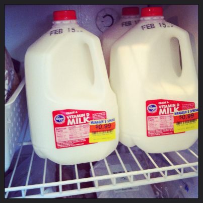 Make no mistake about it….I totally danced a jig in front of the refrigerated section at Kroger when I came across these gallons of milk for a whopping $0.99 each!!!