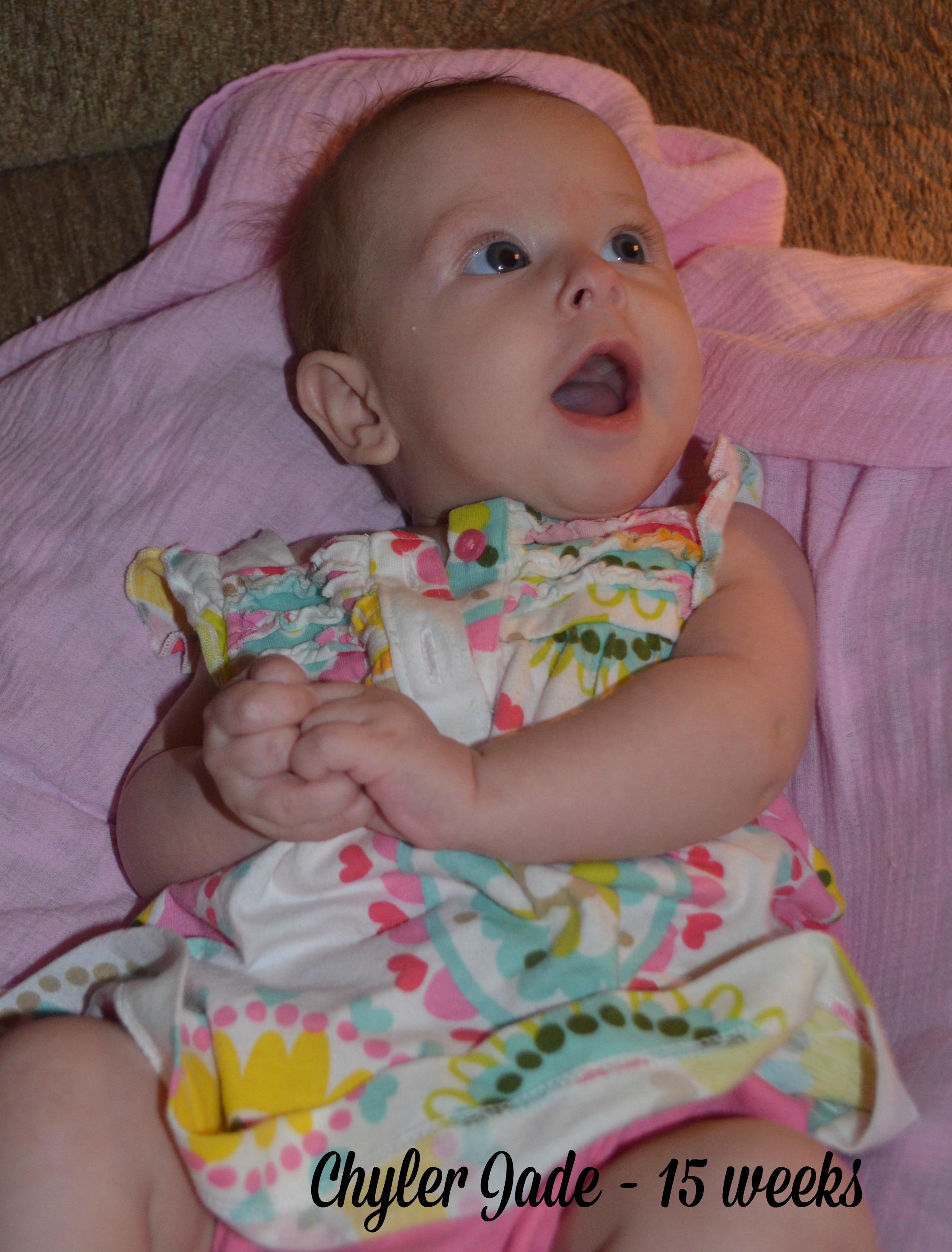 Chyler is now 15 weeks old. That puts her right about 3 ½ months. Just in the past week she’s figured out how to roll from her stomach to her back. And late last week, we heard her laugh for the very first time! It was SO precious! She’s gone back to waking up once during the night to nurse, but waking mommy up once is no big deal……Bubby woke up 3-4 times a night for at least the first year he was with us. Talk about being sleep deprived!!